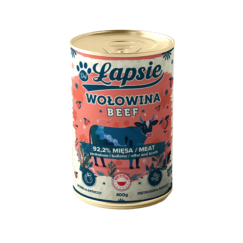 Każda puszka Łapsie to starannie skomponowany posiłek oparty na jednym źródle białka zwierzęcego (monobiałkowy skład), bogaty w naturalny bulion, aromatyczne zioła i soczyste owoce – takie jak gruszka, jabłko, morela czy śliwka.
