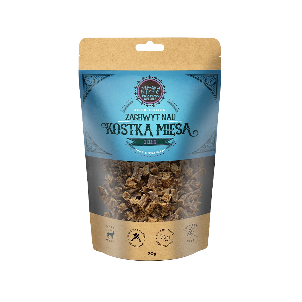 TRZYPSY DELUXE Delight Over Meat Cubes is a natural and healthy delicacy in the form of small cubes made of 100% meat . Careful selection of selected meats and a gentle drying process provide an exceptional feast for the most demanding pets.
