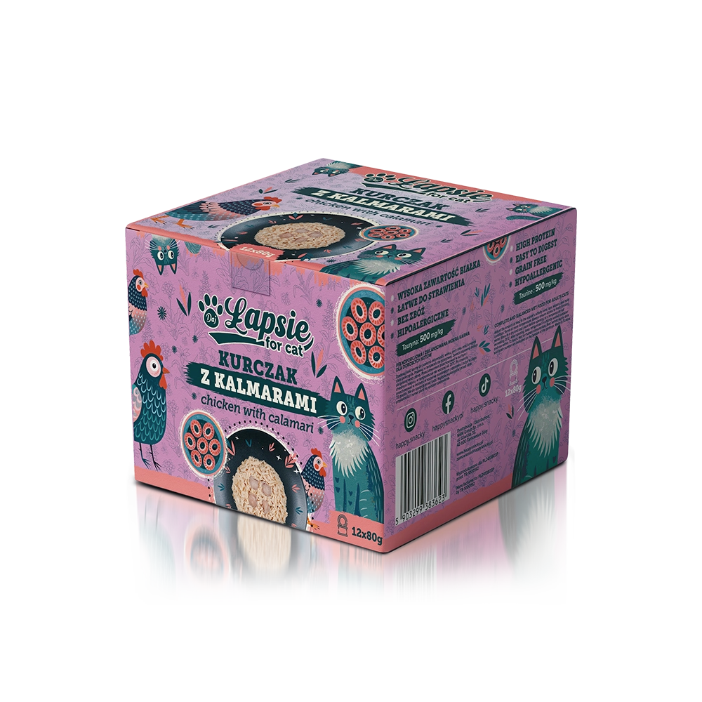 Łapsie for cat – Kurczak w bulionie z kalmarem to pełnoporcjowa mokra karma dla dorosłych kotów, przygotowana z myślą o ich codziennych potrzebach żywieniowych. Zawiera 46% delikatnej piersi z kurczaka oraz 4% kalmara, a całość została zanurzona w aromatycznym bulionie z kurczaka, który podkreśla smak i wspiera nawodnienie organizmu.