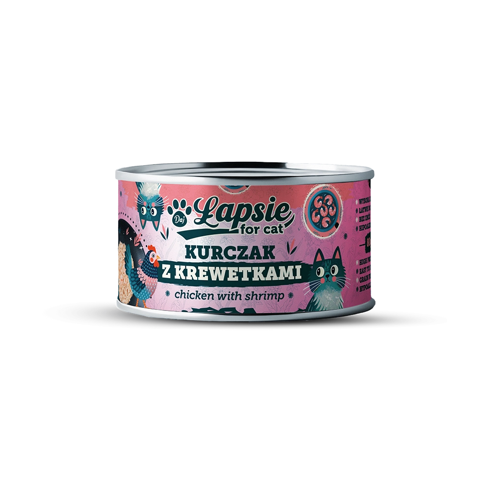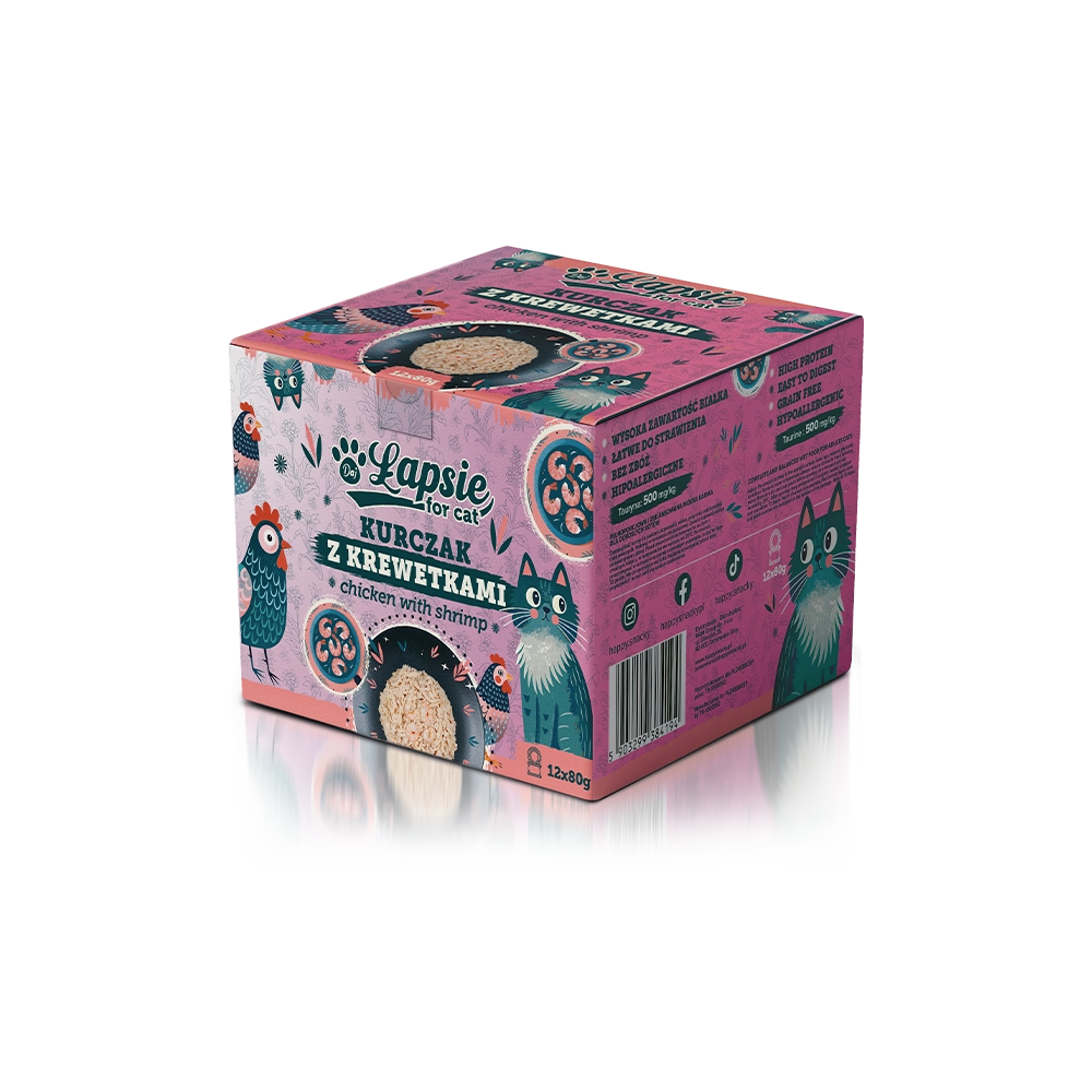 Łapsie for cat – Kurczak w bulionie z krewetką to pełnoporcjowa mokra karma dla dorosłych kotów, przygotowana z myślą o ich codziennych potrzebach żywieniowych. Zawiera 46% delikatnej piersi z kurczaka oraz 4% krewetki, a całość została zanurzona w aromatycznym bulionie z kurczaka, który podkreśla smak i wspiera nawodnienie organizmu.