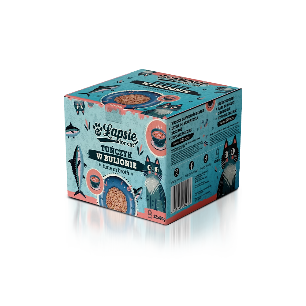 Łapsie for cat – Filet z tuńczyka w bulionie to pełnoporcjowa mokra karma dla dorosłych kotów, przygotowana z myślą o ich codziennych potrzebach żywieniowych. Zawiera aż 50% filetu z tuńczyka – lekkostrawnego, aromatycznego źródła białka, które koty uwielbiają. Całość zanurzona jest w delikatnym bulionie rybnym, który wspiera nawodnienie i podkreśla naturalny smak składników.