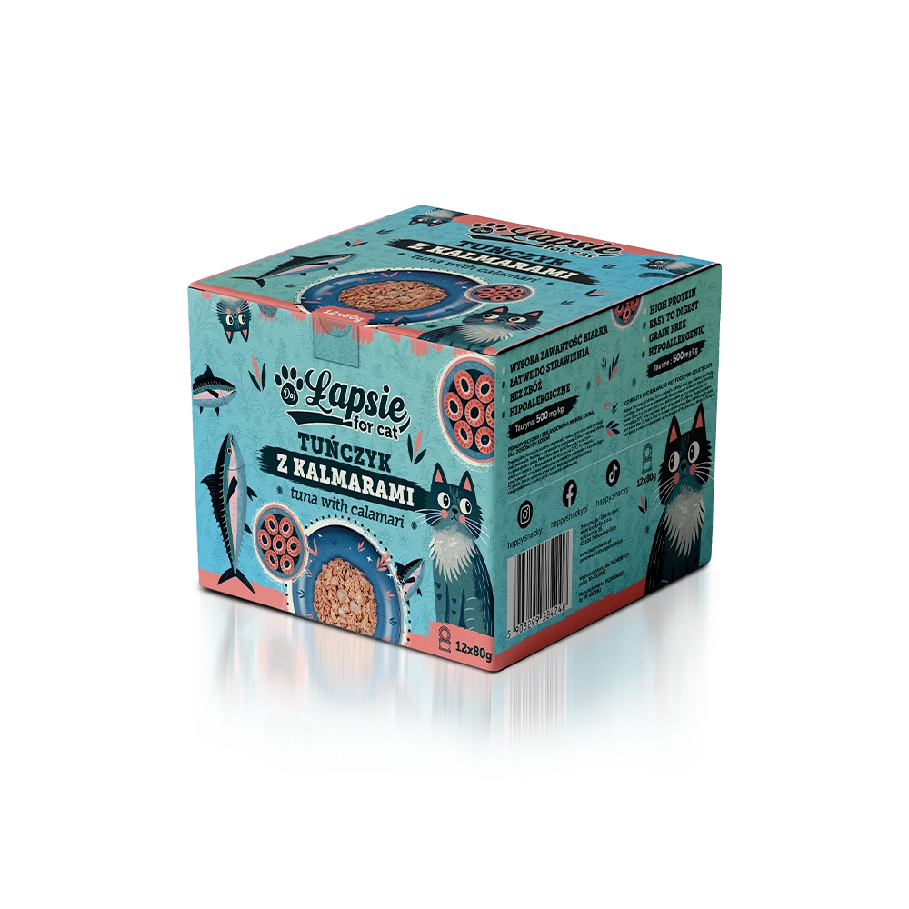 Łapsie for cat – Filet z tuńczyka w bulionie z kalmarem to pełnoporcjowa mokra karma dla dorosłych kotów, przygotowana z myślą o ich codziennych potrzebach żywieniowych. Zawiera 46% filetu z tuńczyka i 4% kalmara, a całość została zanurzona w delikatnym bulionie rybnym, który wspiera nawodnienie i podkreśla smak składników.