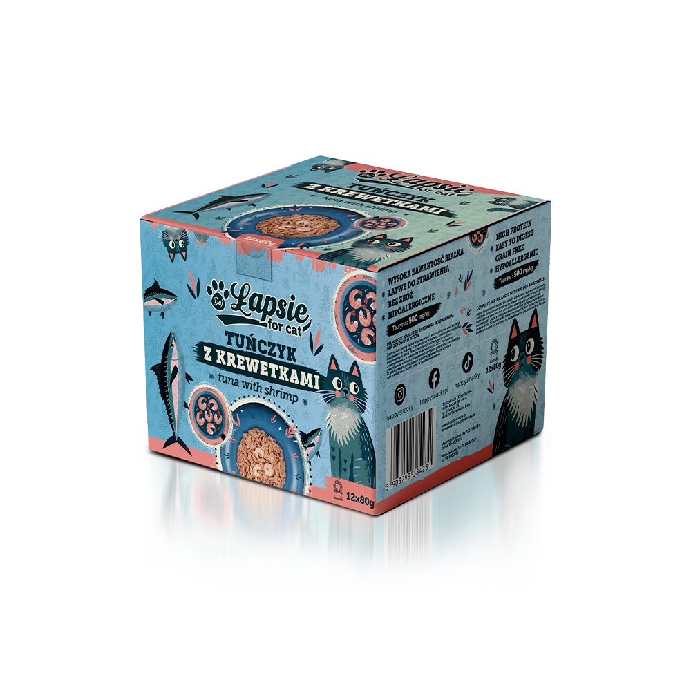 Łapsie for cat – Filet z tuńczyka w bulionie z krewetką to pełnoporcjowa mokra karma dla dorosłych kotów, przygotowana z myślą o ich codziennych potrzebach żywieniowych. Zawiera 46% filetu z tuńczyka i 4% krewetki, a całość została zanurzona w delikatnym bulionie rybnym, który wspiera nawodnienie i podkreśla smak składników.